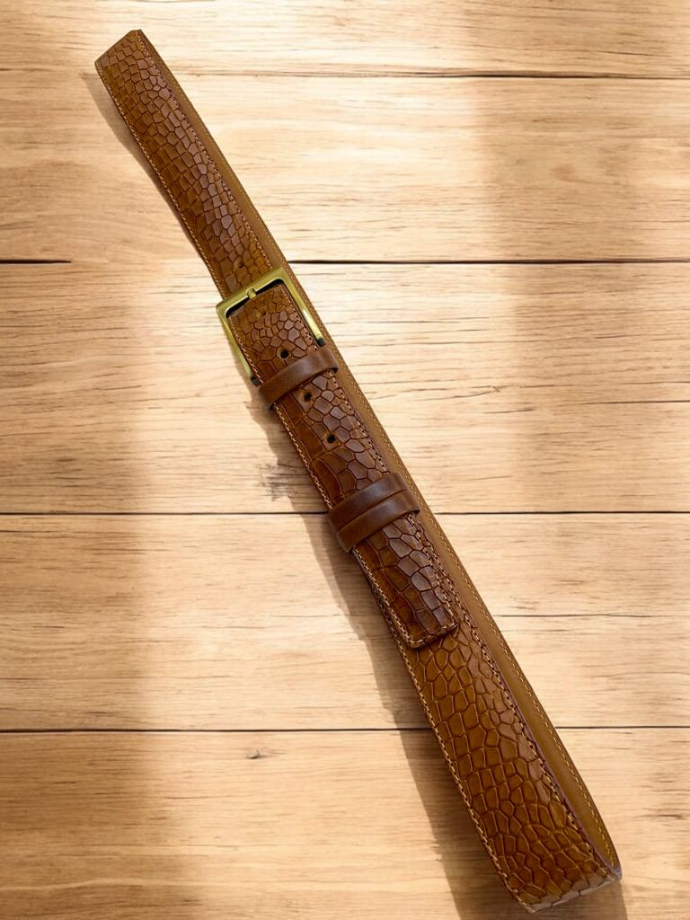 Cognac Reptile belt Gold satin buckle 3,5cm Unique