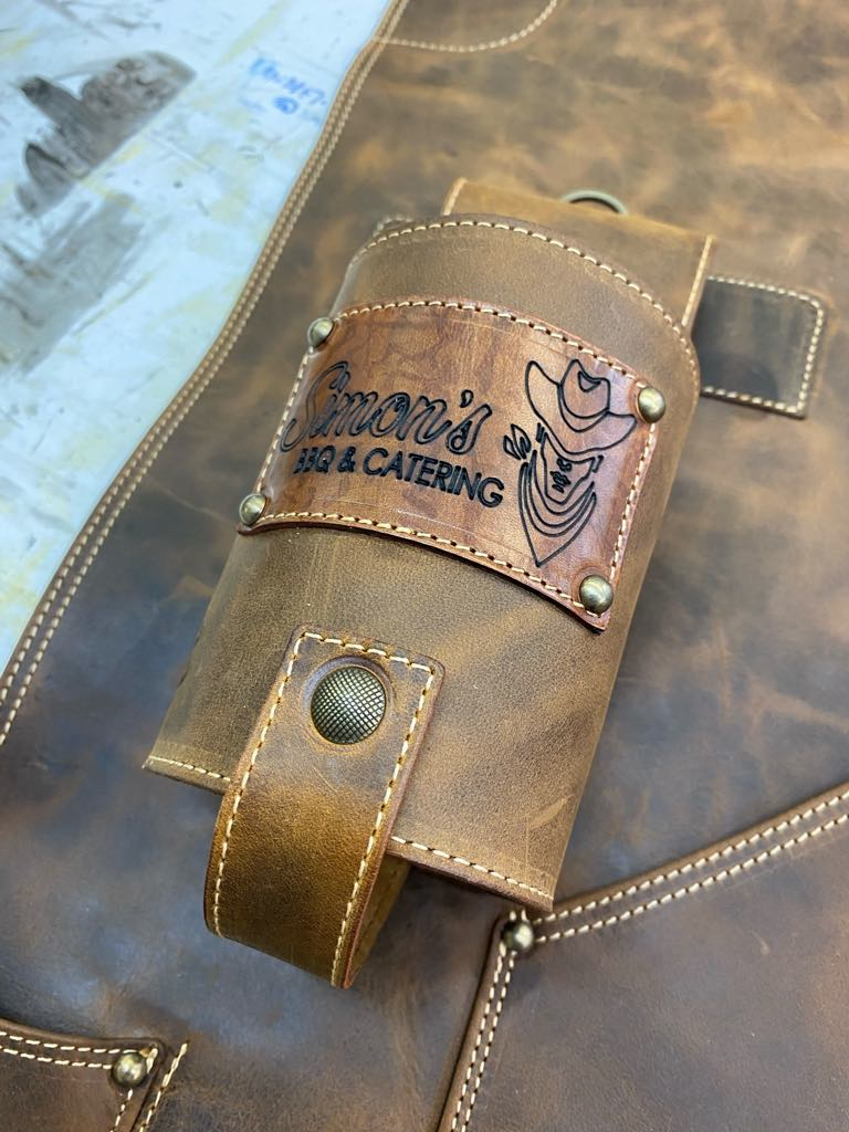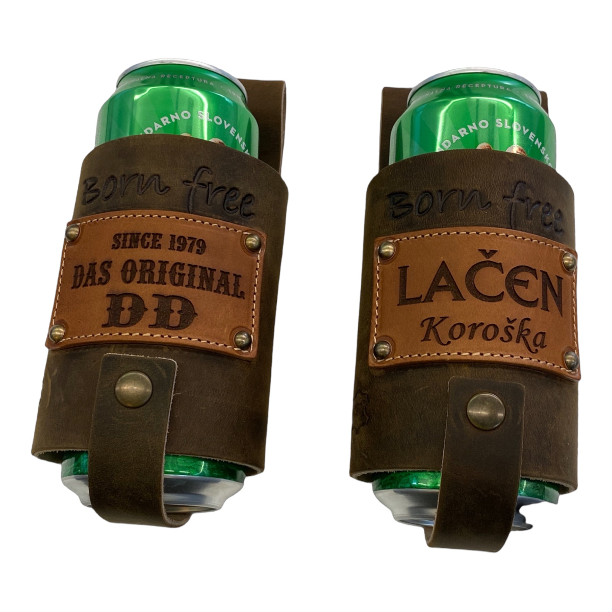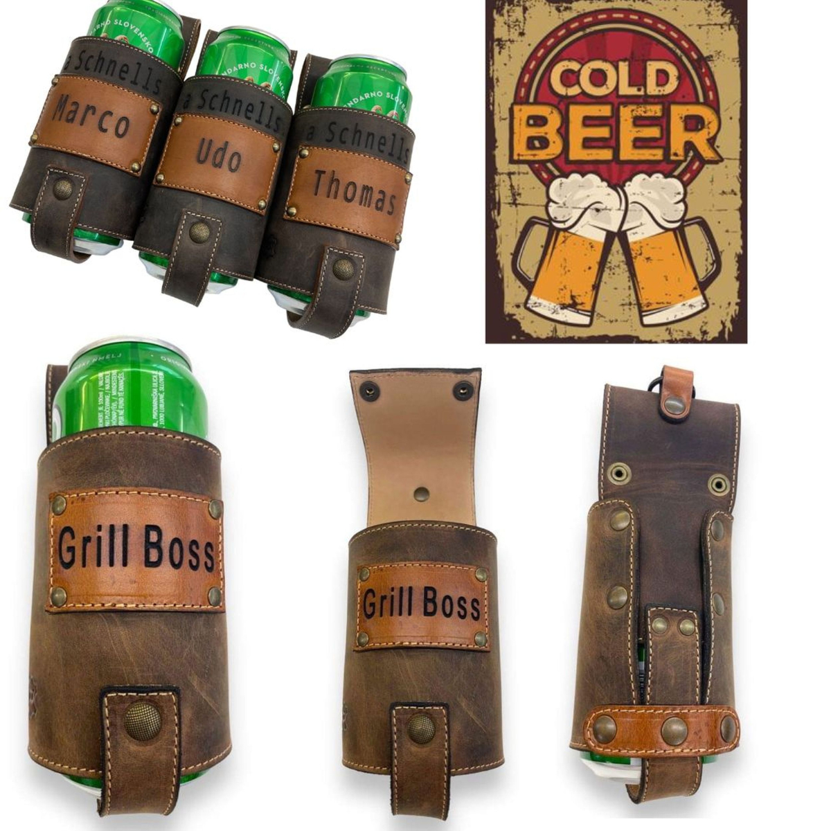 Beer holder with simple and quick attachment to a belt or apron. The dimension also fits bottles and other canned drinks.