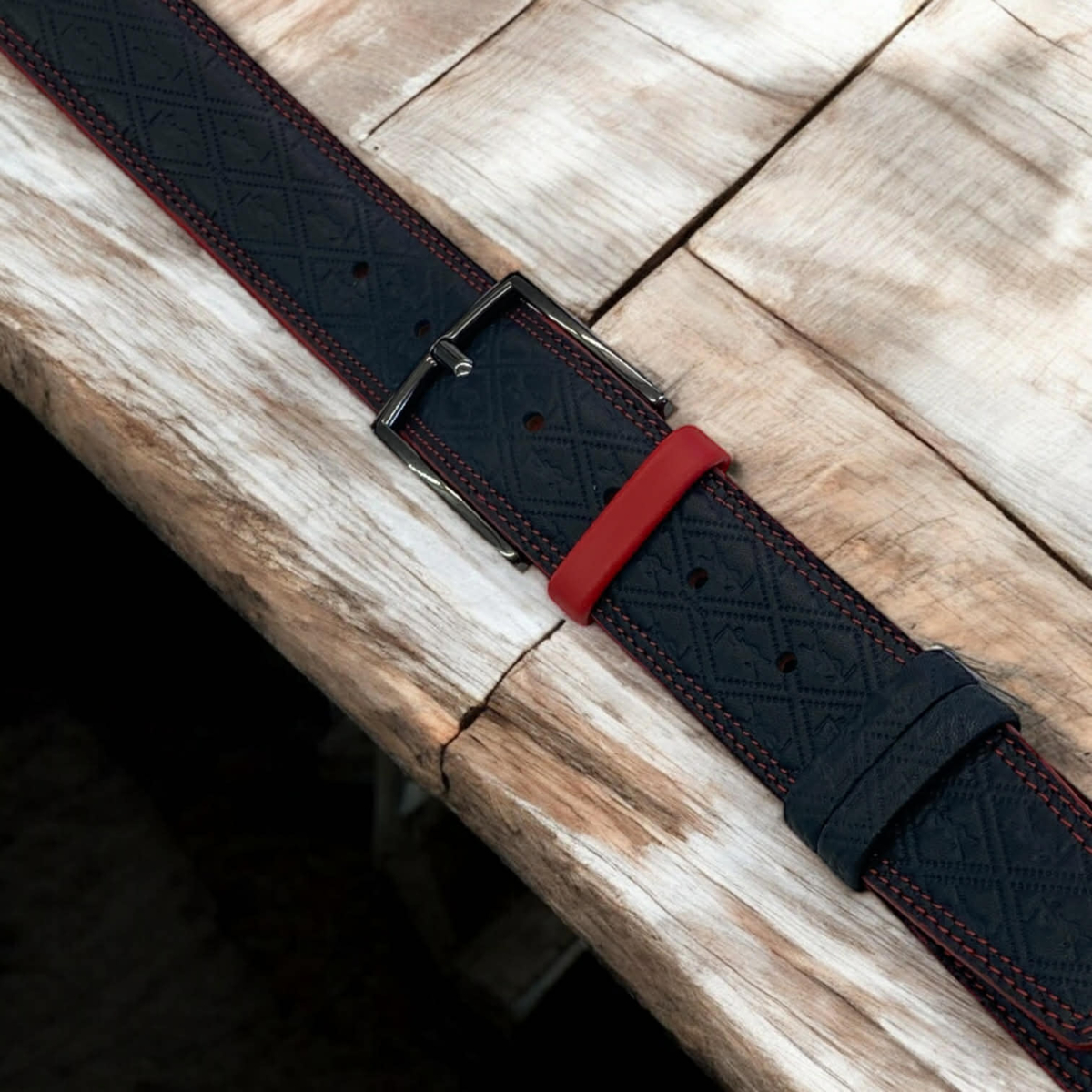 Pas je izdelan v enem kosu iz usnja kravine in kombiniran z imitacijo krokodilje kože.