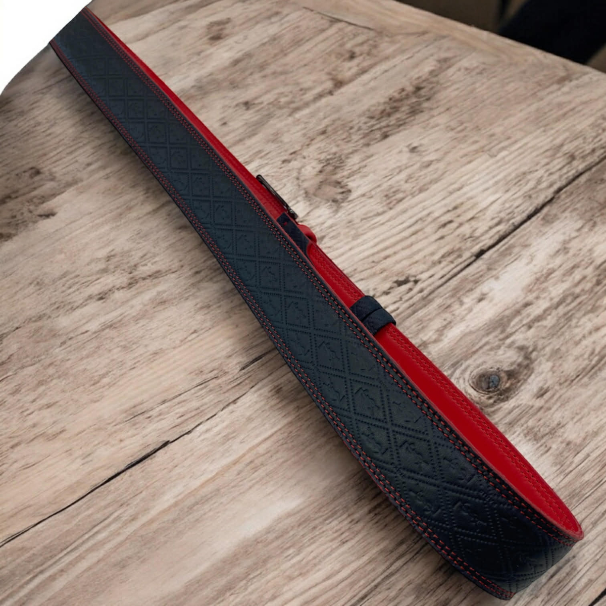 Pas je izdelan iz črnega naravnega usnja s potiskom YSL, v kombinaciji s črno srebrnimi črtami in rdečim usnjem.