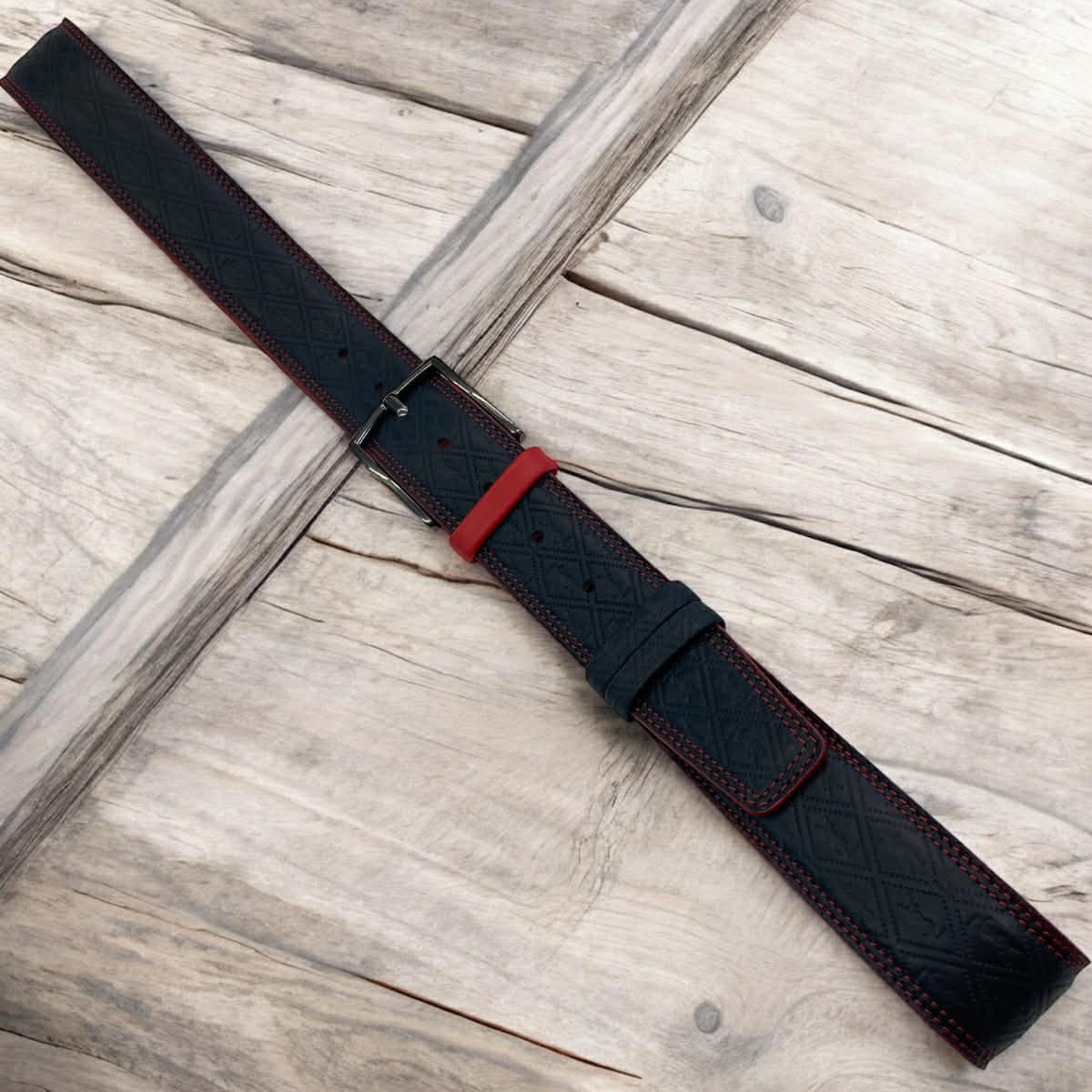 Črni usnjeni pas YSL z rdečimi šivi, širina 4 cm