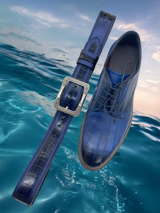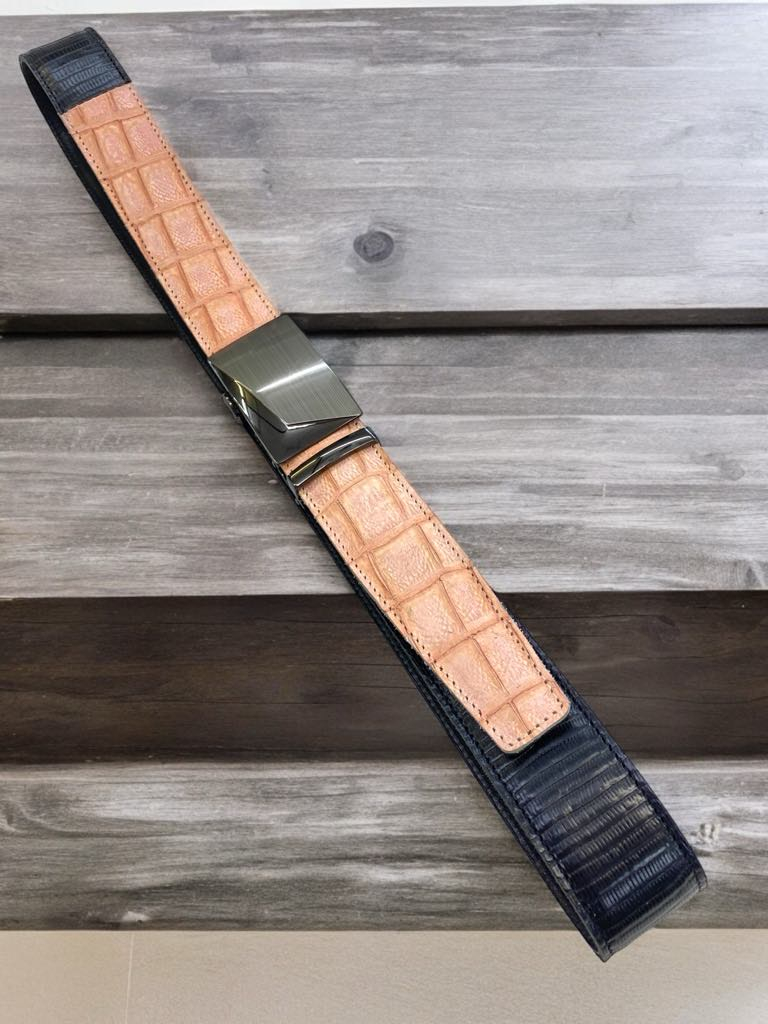 Pas je izdelan iz gladkega govejega usnja, v kombinaciji z odlično imitacijo krokodilje kože.
