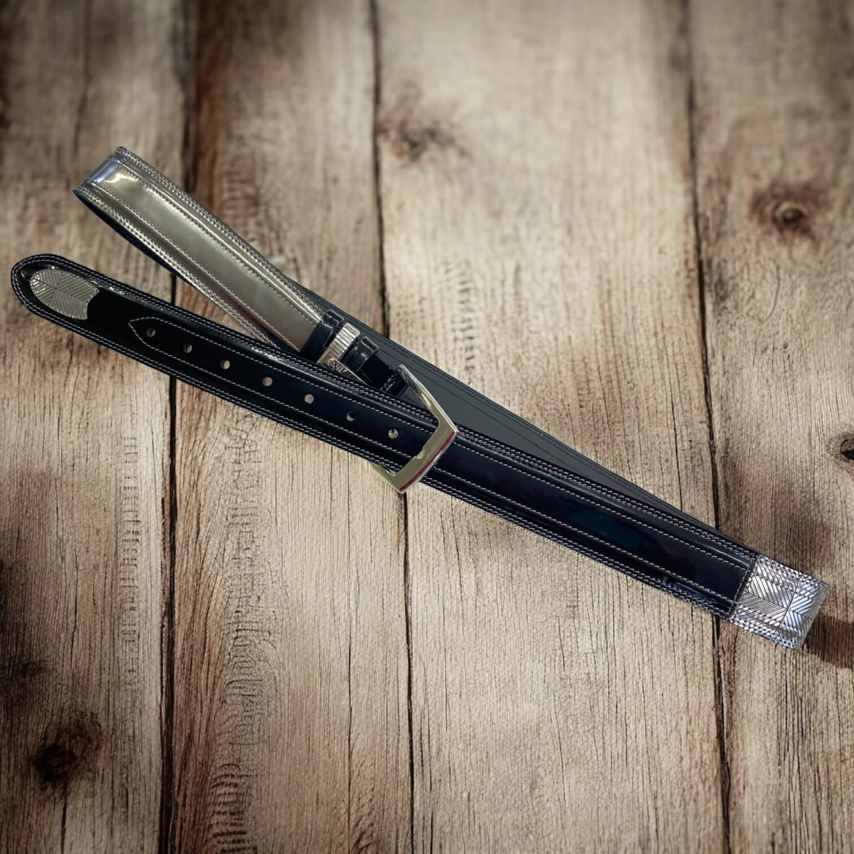 Pas je sestavljen iz srebrnega naravnega usnja z vzorcem ribje kosti, ter črnega in srebrnega polmat usnja.