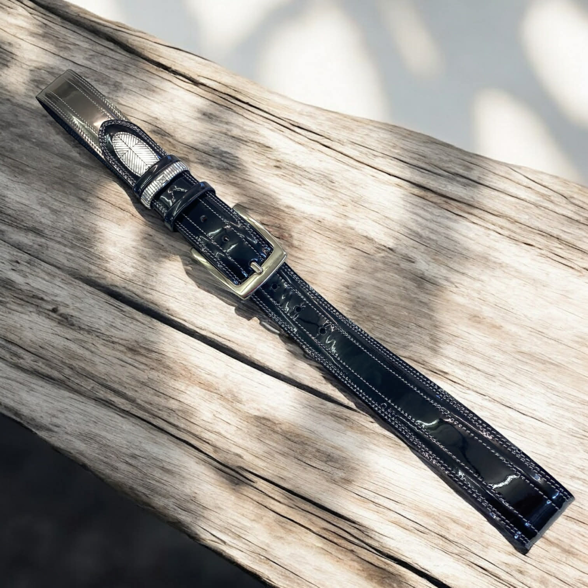 Pas je izdelan v enem kosu iz usnja kravine in kombiniran z imitacijo krokodilje kože.